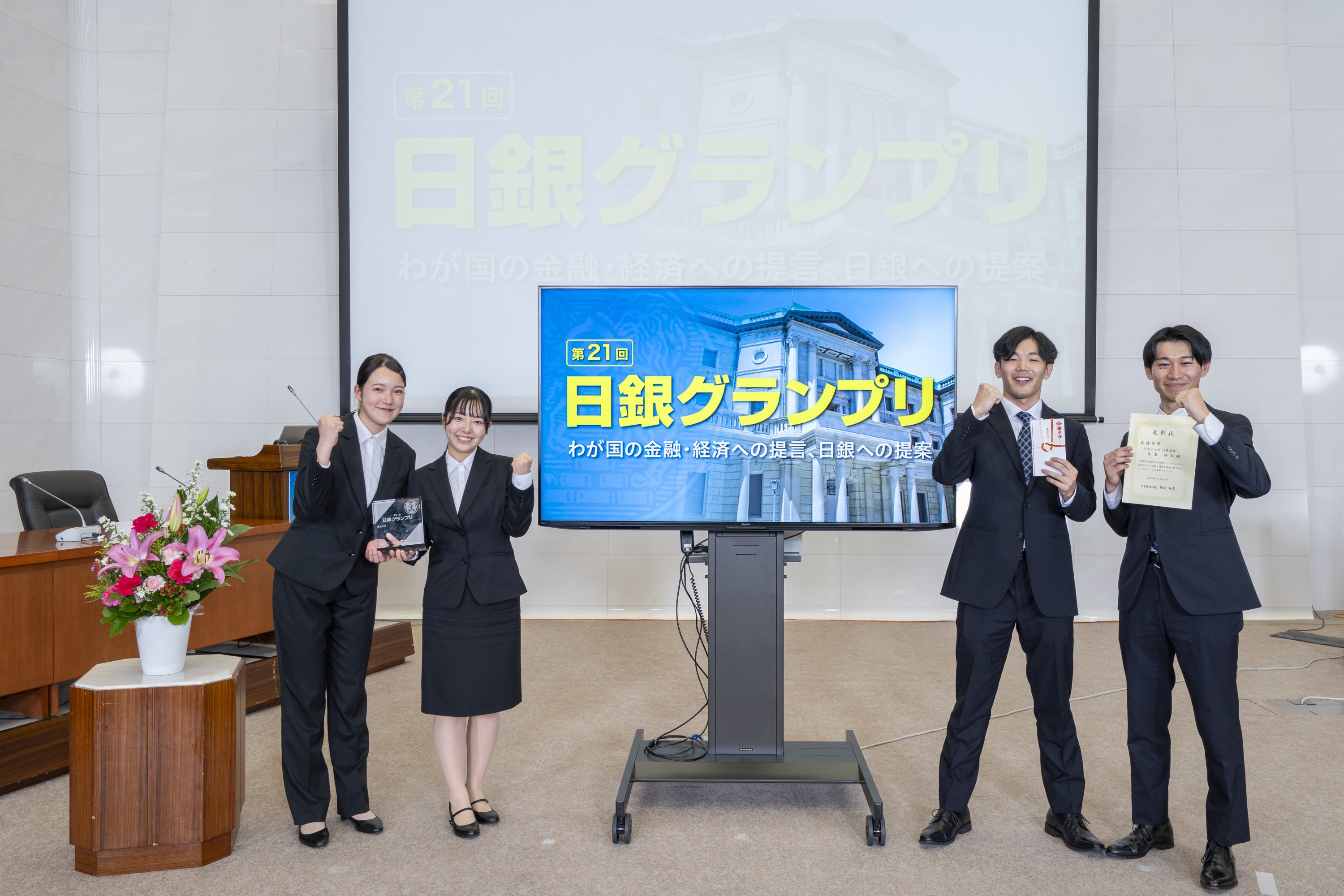 政策学部・足立ゼミ3年次生(佐桒 幹太さん、西﨑 百花さん、吉川 周吾さん、天野 多恵さん)も当決勝大会に選抜され、キャッシュレス化推進に関するプランを発表しました。その結果、「日銀グランプリ」の最高名誉である「最優秀賞」を受賞しました!